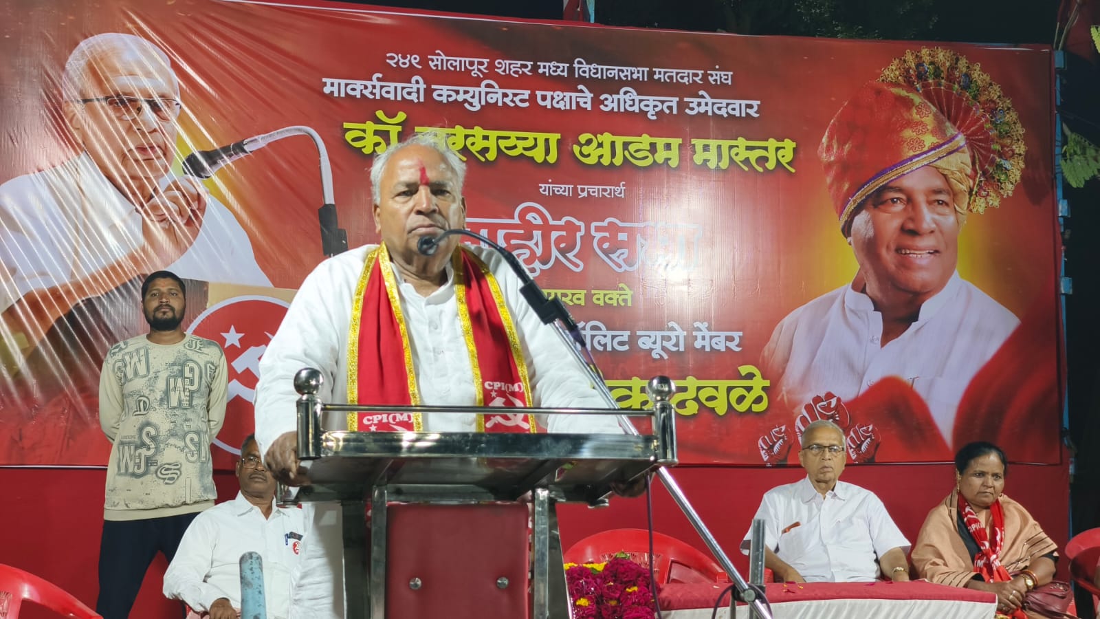 रविवार 249 सोलापुर सिटी सेंट्रल विधानसभा निर्वाचन क्षेत्र में मार्क्सवादी कम्युनिस्ट पार्टी के आधिकारिक उम्मीदवार कॉमरेड नरसैया एडम मास्टर के प्रचार के लिए आंध्र दत्त चौक दाजी गणपति में कॉमरेड वेंकटेश कोंगारी की अध्यक्षता में एक भव्य सार्वजनिक बैठक आयोजित की गई।