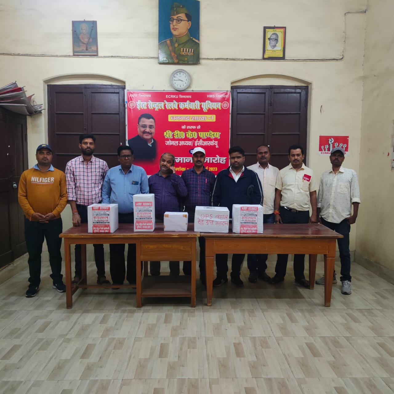 धनबाद: AIRF/ECRKU के आवाहन पर एनपीएस को समाप्त कर OPS लागू करने की मांग को लेकर दिनांक 21/11/23 और 22/11/23 को गुप्त मतदान कार्यक्रम रखा था, जिसमें ECRKU धनबाद के शाखा 1 के पदाधिकारियों द्वारा अपने कर्मचारियों के बीच मतदान बॉक्स लेकर मतदान कराया ।