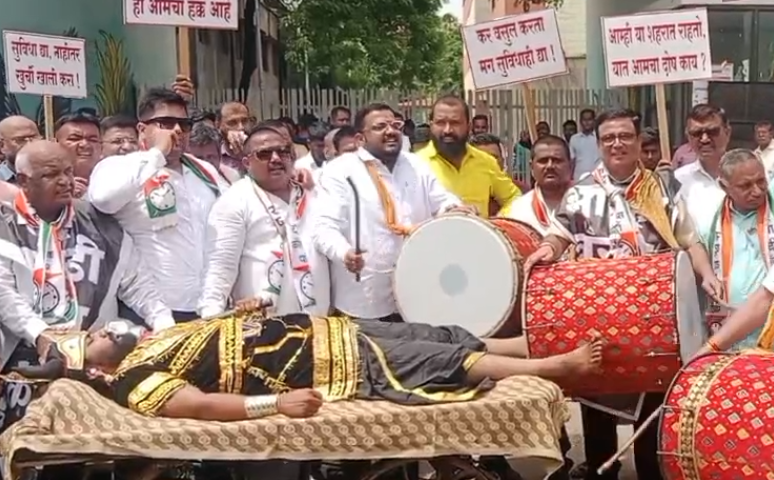 धुले:- राष्ट्रवादी कांग्रेस पार्टी (अजित पवार गुट) ने आज धुले शहर में बढ़े हुए किराए और अन्य नागरिक मुद्दों के खिलाफ ढोल-बाजा आंदोलन किया। पार्टी कार्यकर्ताओं ने नगर निगम प्रशासन से जवाबदेही मांगते हुए अनोखे अंदाज में प्रदर्शन किया, जिसमें सोए हुए कुंभकर्ण की जीवित झांकी को रथ पर सवार कर शहर में परेड कराई गई। इस दौरान “धुलेकरों, आओ मिलकर नगर निगम को जगाएं” जैसे नारों से पूरा क्षेत्र गूंज उठा।