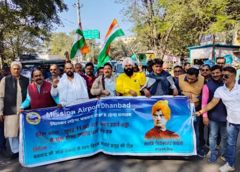 धनबाद:- मिशन एयरपोर्ट के तत्वाधान में बरवड़ा हवाई अड्डा से शपथ समारोह के साथ-साथ पदयात्रा निकल गई है जो हवाई अड्डा से चलकर मेमको मोड़, धैया, लुबी सर्कुलर रोड होते हुए रणधीर वर्मा चौक पर धरना सभा स्थल में तब्दील हुई। इस मिशन एयरपोर्ट में समाजसेवी बुद्धिजीवी और व्यापारी वर्ग के लोग सम्मिलित हुए। मिशन एयरपोर्ट का स्लोगन “लड़ेगा धनबाद तो उड़ेगा धनबाद” से धनबाद वासियो से समर्थन की अपील की है।