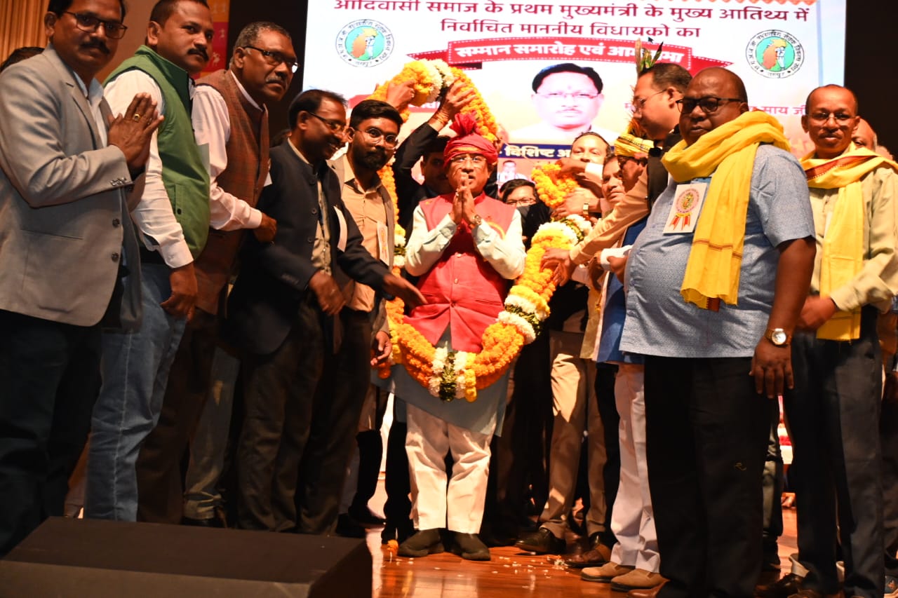 रायपुर-छत्तीसगढ़:- मुख्यमंत्री विष्णु देव साय आज राजधानी रायपुर स्थित पंडित दीनदयाल उपाध्याय ऑडिटोरियम में अनुसूचित जनजाति शासकीय सेवक विकास संघ द्वारा आयोजित आदिवासी समाज के नवनिर्वाचित विधायकों के सम्मान समारोह एवं आमसभा में शामिल हुए।मुख्यमंत्री साय नें दीप प्रज्ज्वलित कर समारोह की शुरुआत की।